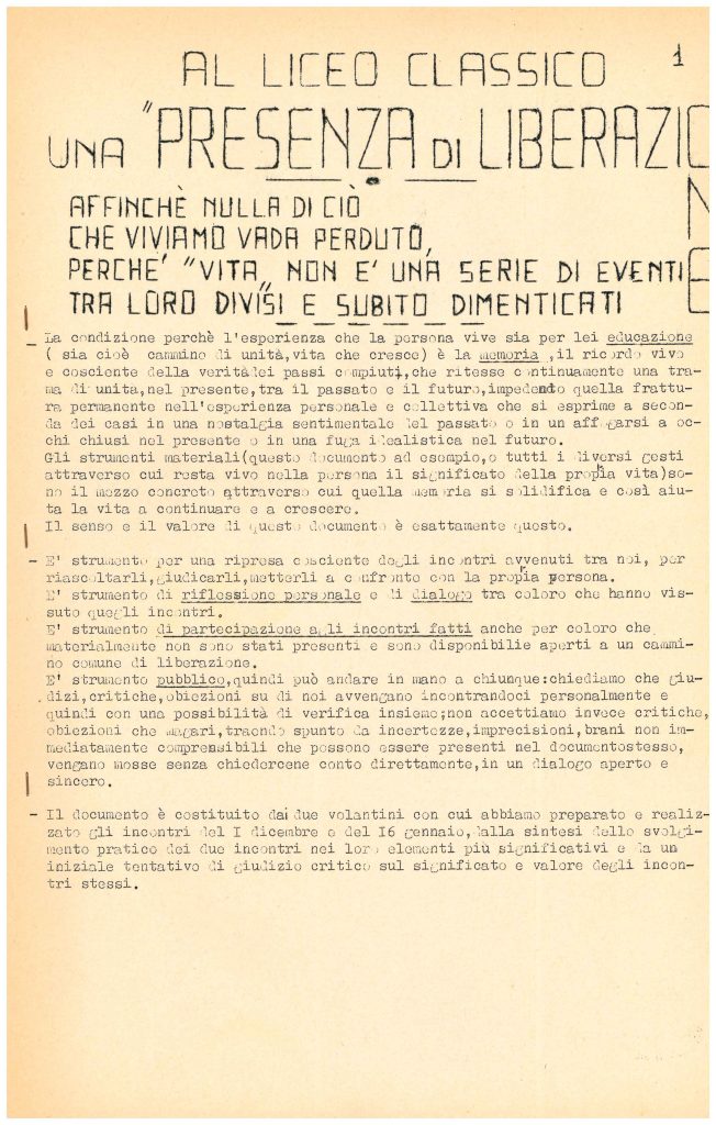 Un volantino comunicava il tema dell’incontro ed era distribuito personalmente da tutti i membri di GS, per lo più all‘inizio della settimana, non solo a coloro che erano già interessati e si sapeva avrebbero partecipato all’incontro, ma anche agli altri compagni di classe, che da quell’insistenza benevola sarebbero stati prima o poi portati a interrogarsi almeno sul significato di quella sigla «Gioventù Studentesca», e di quell’invito così ripetuto. […]
