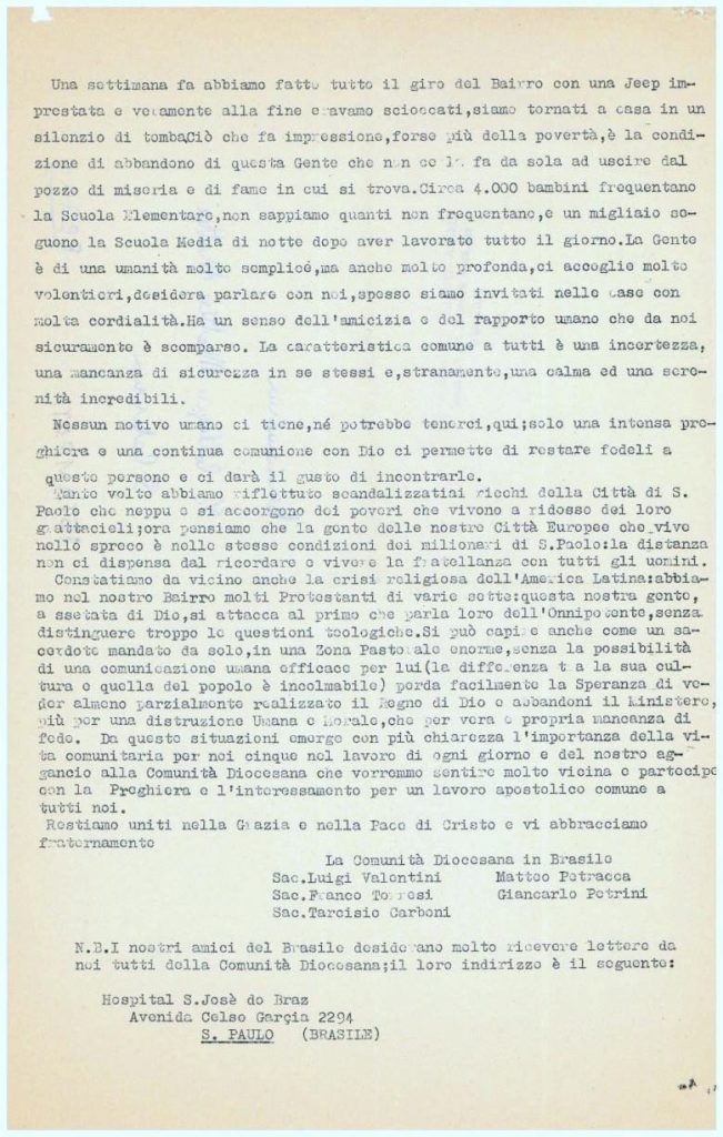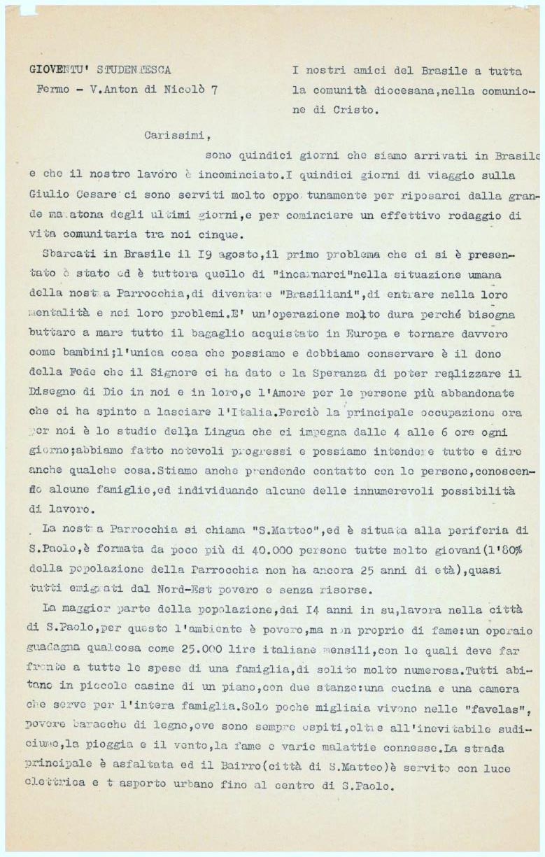La prima lettera inviata dal Brasile a soli quindici giorni dal loro arrivo a San Paolo, ciclostilata a cura della Segreteria di GS e diffusa pubblicamente.